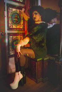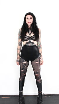 A combination of black wet look spandex with fishnet with wholes on it!!!!! Wear it with your favorite Sophireaptress top!!